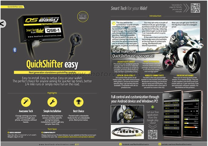 El iQSE ha sido diseñado para que su instalación y uso sea lo más amigable posible. Su instalación es plug-and-play (cableados específicos de instalación fácil a su modelo de moto) y se puede acceder a las opciones de configuración vía bluetooth a través de una aplicación Android o app iPhone/iPad. Se puede descargar y probar los apps del iQSE para:Android y Apple